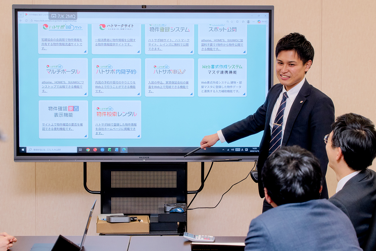 全宅連の事務局職員として①会員業務支援サイト「ハトサポ」等の運営に関する業務全般、② 「ハトサポ」および消費者向け物件情報提供サイト「ハトマークサイト」を所管する「情報提供委員会」の運営業務を担当しています。「ハトサポ」は、宅建協会会員が利用できる業務支援サイトで、物件情報登録・公開システムをはじめ、契約書作成・電子契約などの実務ツールを提供し、会員の業務効率化・DX化を支援しています。